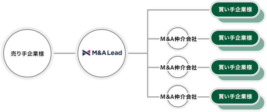 当社ではこのような機会損失や時間の無駄を無くし、より早く、より多くの売却の選択肢を売り手企業様に届けられるよう、買い手企業様へのアプローチにおいては、他の仲介業者様とも最初から連携して、買い手企業様へのアプローチを行い、買収オファーをお届けします。